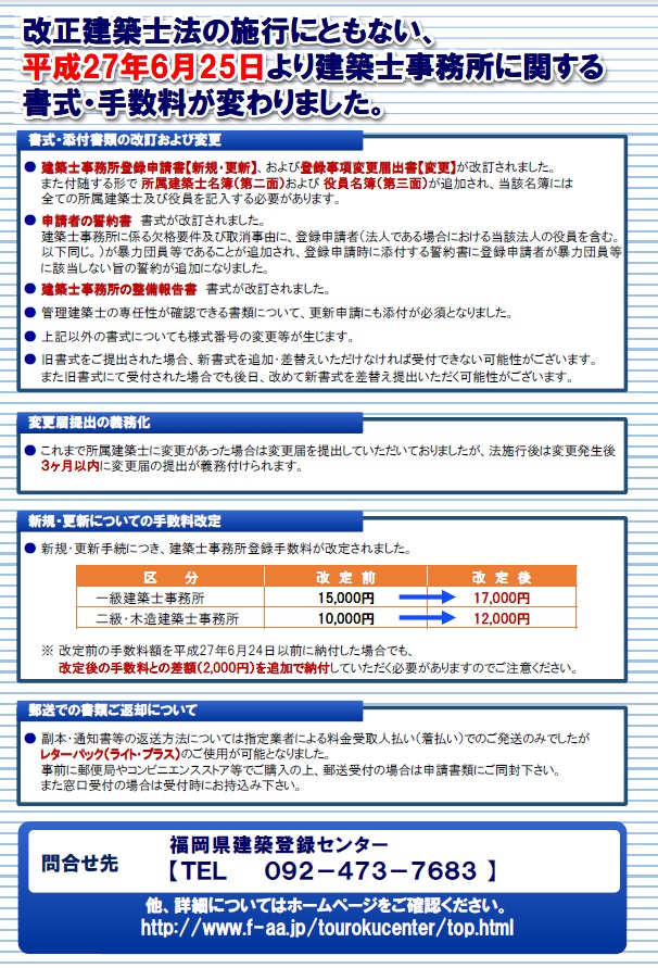 改正建築士法の施行に伴い、平成27年6月25日(木)より建築士事務所登録に関する書式・手数料等が変わりました。主な変更内容は以下のとおりです。